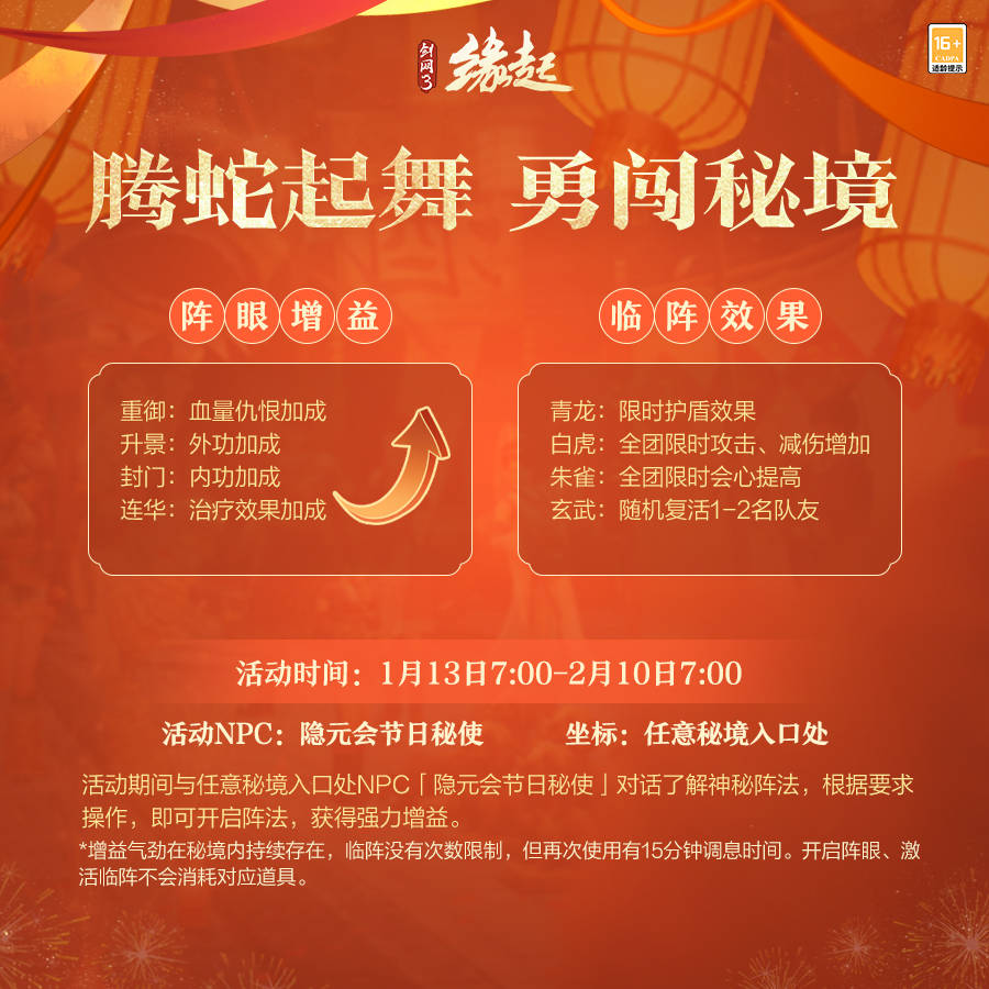 近日,游戏中各大秘境的入口前,纷纷涌现出一批神秘的访客——“隐元会节日秘使”。他们与过往的侠士交谈后,便施展出一种前所未有的神秘阵法。不少侠士有幸被选中,携带这股神秘力量进入秘境,不仅短时间内便满载而归,脸上更是洋溢着难以掩饰的喜悦。原来,这正是融合了青龙、白虎、朱雀、玄武四大神兽之力的增益大阵,它能赋予侠士们重御、升景、封门、连华四种强大的阵眼增益,令他们在探索秘境时如虎添翼,一帆风顺。